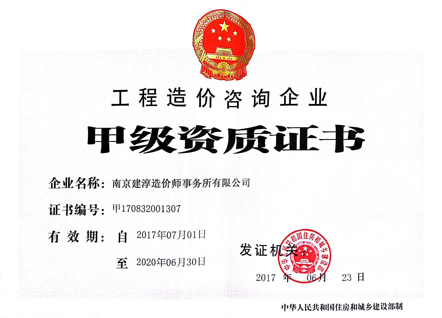 工程造價咨詢企業(yè)甲級資質(zhì)證書